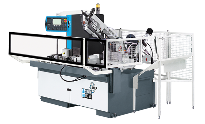 Leistungsstarke Gehrungsbandsägemaschine für Schnitte von 45° rechts bis 60° links. Elektrohydraulischer Halbautomat mit Windows CE basierter Touch-Screen-Steuerung. Rund: 250 mm, Quadrat: 220 mm, Rechteck: 280 x 220 mm