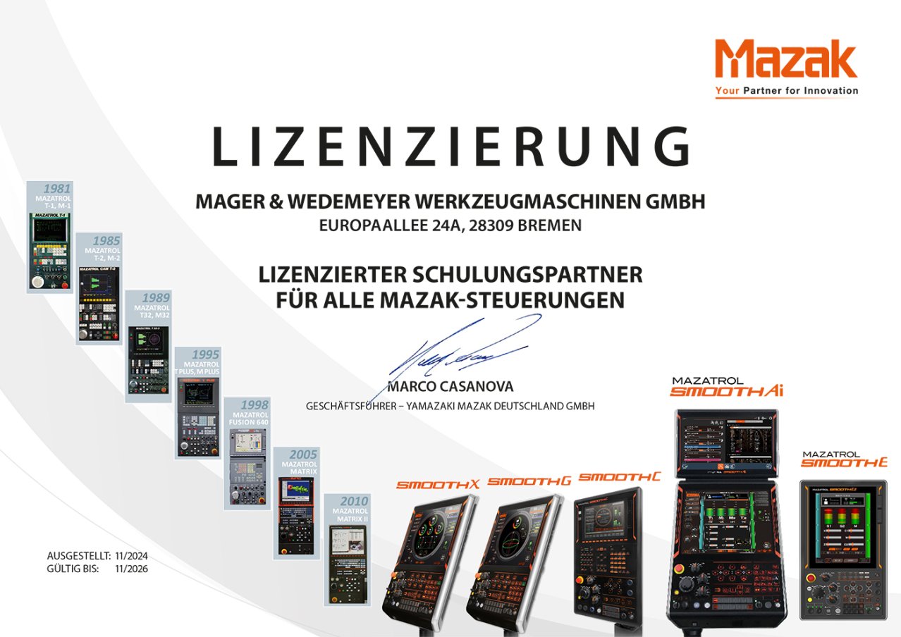 Für unseren Partner Mazak sind wir seit fast 25 Jahren als Schulungspartner tätig und haben qualifizierte Kenntnisse in der umfangreichen Auswahl an Mazatrol-Steuerungen. Unser Spektrum reicht von den T2/T3 oder M2/M32 bis hin zur Smooth Generation.